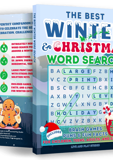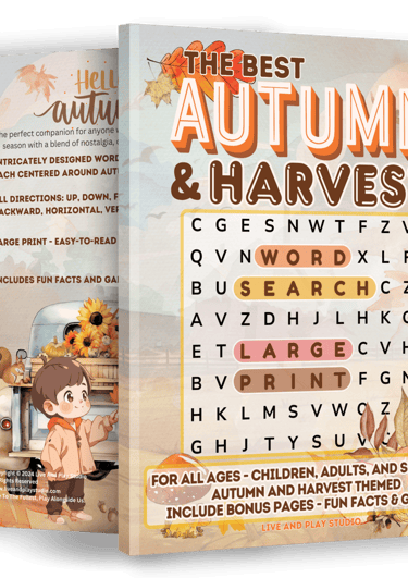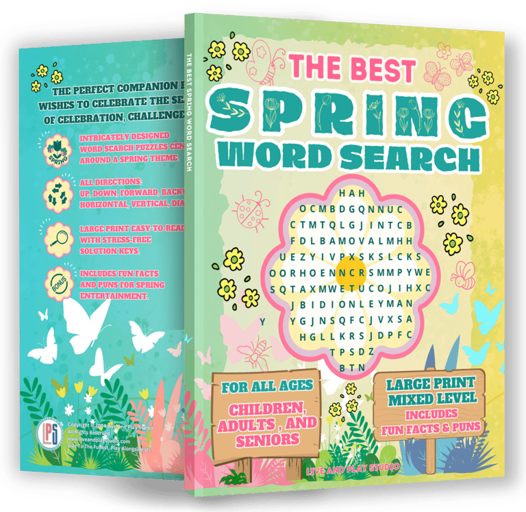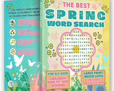 Large Print and mixed-level Stress Relief Brain Games, Including Fun Facts and Puns. Spring Season-Themed Word Search Puzzles with pages featuring Fun Facts and Puns. These puzzles are mixed-level and family-friendly.